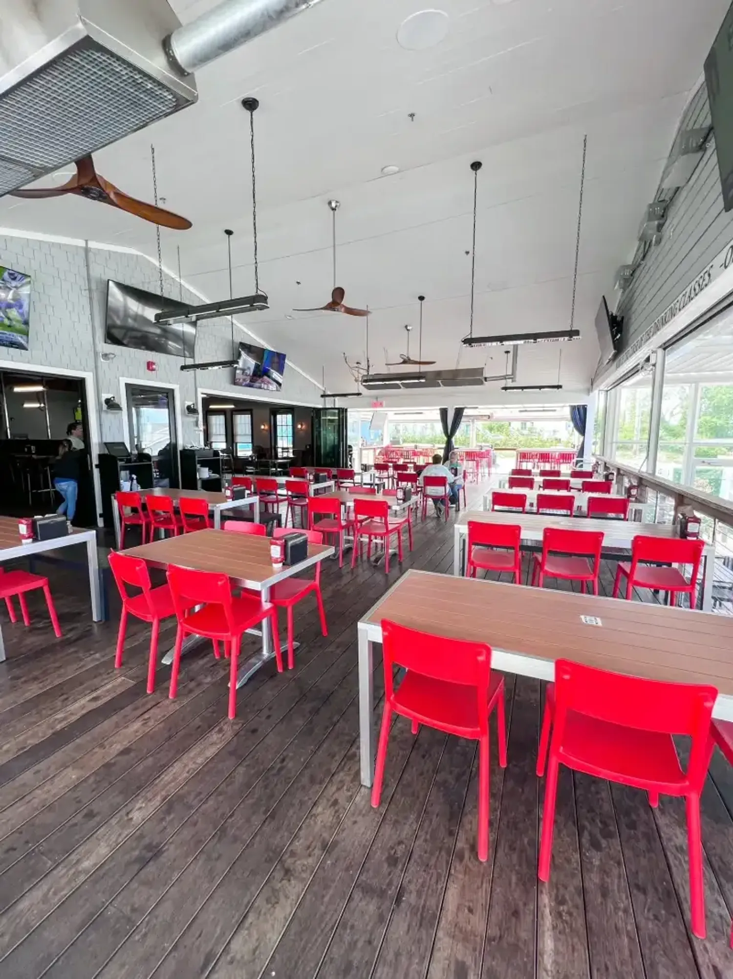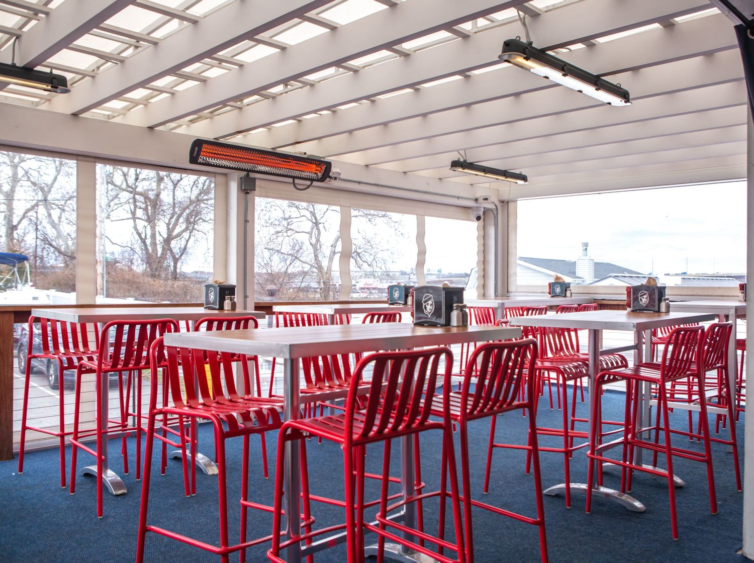 Perfect For: Year-round indoor/outdoor dining with a view. Our Upper Deck is covered for summer shade and open-air marina vibes, then transforms into a cozy enclosed space for fall and winter—complete with heaters and TVs so you can stay warm while catching your favorite games.
